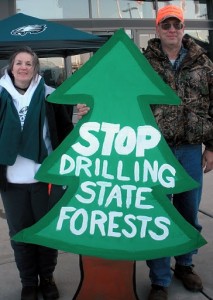 Sadly, the state has already leased off too much state forest and park land for eventual use by natural gas drillers. The good news is, though, that Governor Corbett has not (so far) lifted the moratorium on further leasing. We sent him the photos of Eagles fans holding up these signs in order to encourage him to keep the moratorium on.