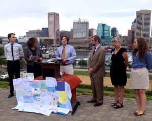 The podium and a colorful display of children’s “protect clean water” drawings were set in front of the Baltimore Harbor, where in 2010 a coalition of businesses, nonprofit groups, and City agencies formed the “Healthy Harbor” initiative, which aimed to increase efforts to eliminate polluted runoff and trash in the Harbor and to achieve fishable, swimmable, drinkable water by 2020.