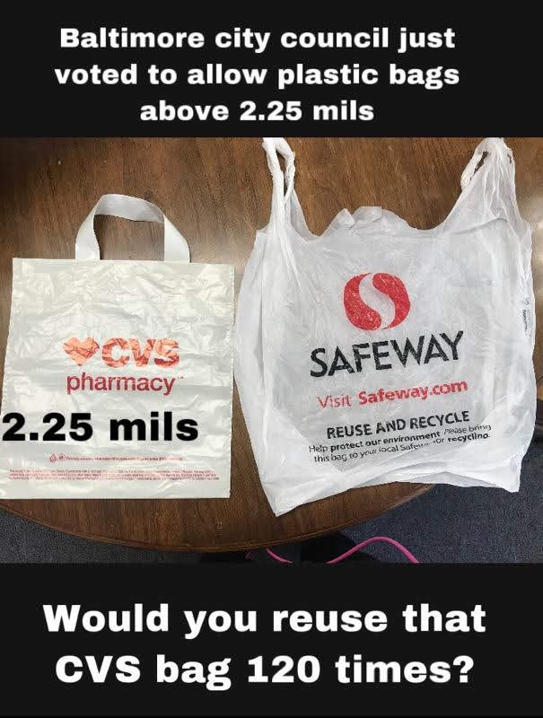 On Monday October 7 at 1:00 pm, I attended the Baltimore City Council Judiciary Committee's work session on the Plastic Bag Reduction Bill (#19-0401). It had to do with redefinition of a banned "plastic checkout bag" from a maximum thickness of 4 mils (thousandths of an inch) to a mazimum thickness of 2.25 mils. This would mean that distribution of plastic bags below 2.25 mils would be disallowed, and distribution of those between 2.25 and 4 mils to customers would be standard. In essence, a slightly thicker bag would be standard to encourage a false spirit of reusability. According to Cailey Locklair of the Maryland Retailers Association, who was present at the work session, "These bags will be able to be used 120 or more times" and "4 mils is an arbitrary industry standard." Though this would introduce a thicker bag, one must question if it would be truly effective in removing any plastic bags from the street. It seems as if there will be the same quantity of plastic bags with higher thickness which would perpetuate the same problems that currently stand with thinner plastic bags.