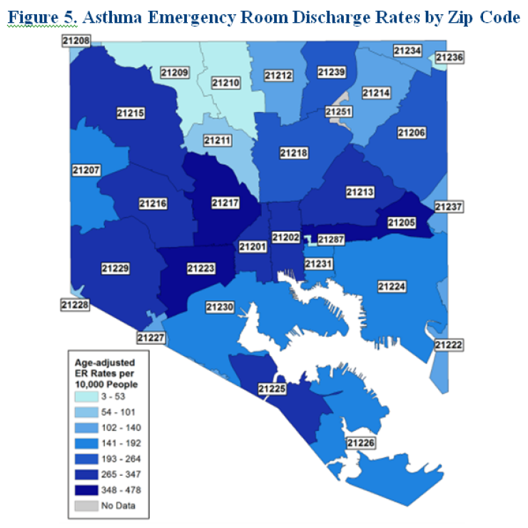 EIP is extremely appreciative of the time and resources that the Maryland Department of Health has expended in making available the zip code level asthma data discussed in this report. We are also very grateful to officials within the [Maryland] Department of Health for taking the time to provide helpful input in responses to questions that we have raised about the data as we wrote this report. However, there is a way in which the asthma data could be made even more helpful to residents of Baltimore City. The Baltimore Neighborhood Indicators Alliance (“BNIA)” tracks poverty and a number of other factors in the city at the level of community statistical areas, which are clusters of census tracts, and issues annual reports on this data called Vital Signs reports. If possible without violating privacy requirements, the Maryland Department of Health should make asthma data available at this level for Baltimore City. This data would allow a direct comparison with many of the factors tracked by BNIA, such as measures of poverty and also other measures relating to health and quality of life, including housing. Being able to make a direct statistical correlation would assist in identifying the factors that are most contributing to the high asthma rates in Baltimore and could potentially identify any that might affect certain neighborhoods. (See pages 48-49 of the attached report.)