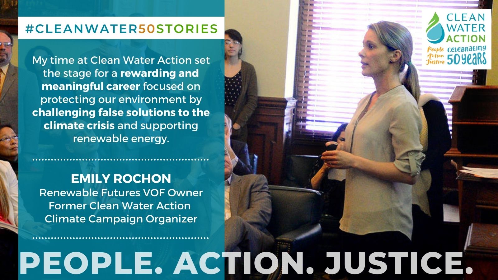 Meet Emily Rochon, a true force of nature helping to lead the way for a clean energy future. Emily has played important roles in the clean energy industry, advancing solar and offshore wind projects -- and she got her start as a climate organizer for Clean Water Action in Rhode Island. Emily's story is one of many we will feature throughout our 50th anniversary year, lifting up our history and the people along the way who have contributed to our legacy and created impact. Emily inspires us, and we bet she will you inspire you too!