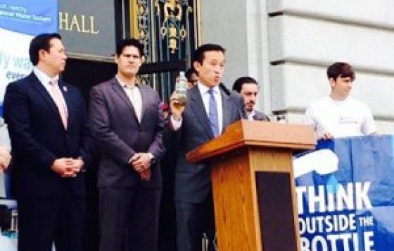 San Francisco Supervisor Chiu holds up a plastic water bottled filled with the amount of oil it takes to make just one bottle! By Samantha Meyer, Zero Waste Program Manager - Follow the campaign on Twitter: @Rdisposable It’s already been a big month for cracking down on plastic pollution in
