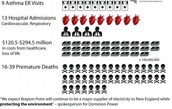 Emissions from coal-fired Brayton Point Power Station in 2012 caused between 15 to 39 premature deaths and a host of additional health impacts from heart attacks to emergency room visits according to a new analysis released by Coal Free Massachusetts. Although the aging plant, located in Somerset