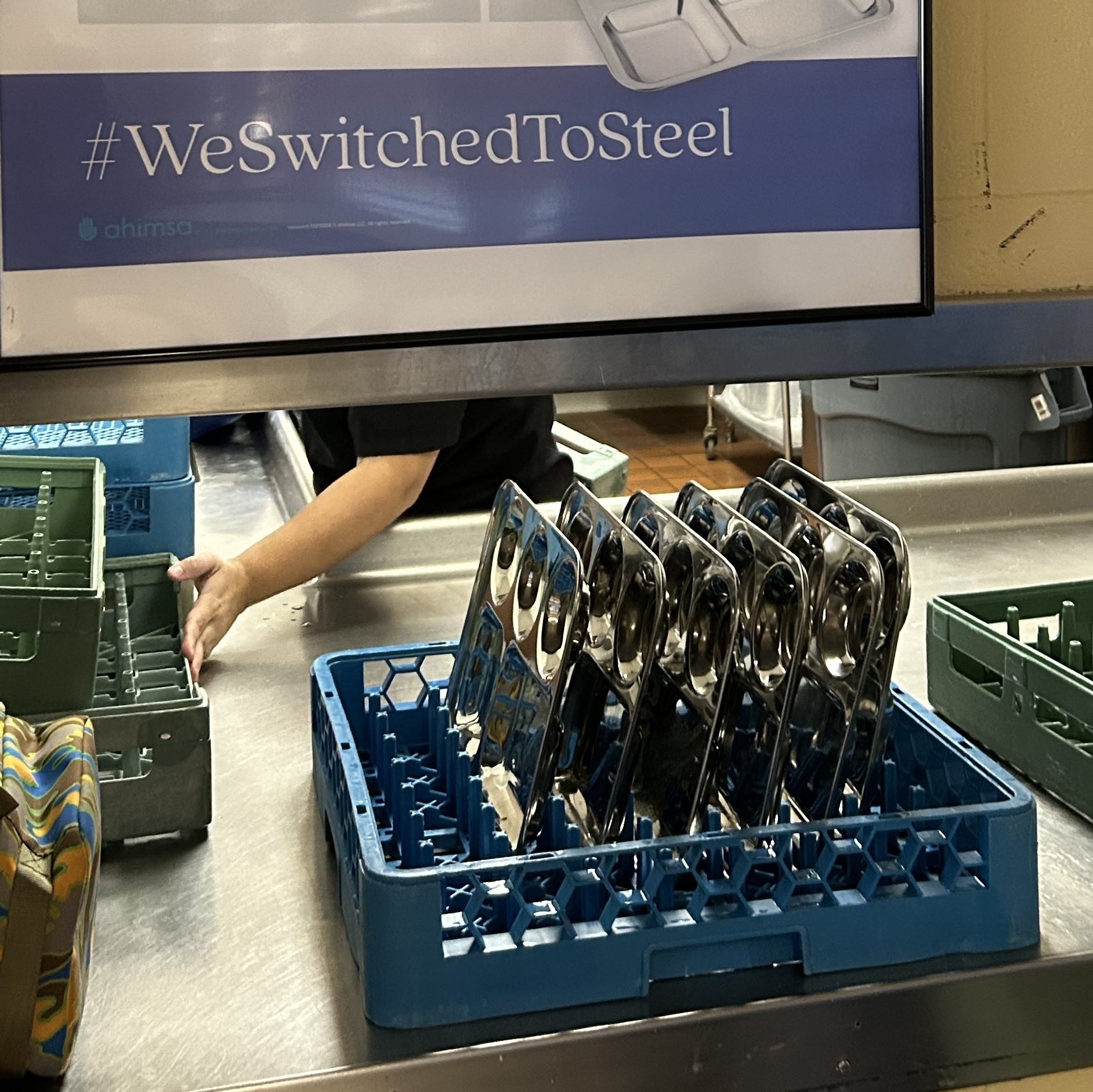 Thanks to a generous donation from PlasticFreeRestaurants.org, the schools’ polystyrene (foam) lunch trays were traded for Ahimsa stainless steel reusable trays in December 2024. This was the final phase of a district-wide cafeteria waste reduction program; since 2023, the district has implemented a food share table, and separating recycling, food scraps, and liquids from true trash.