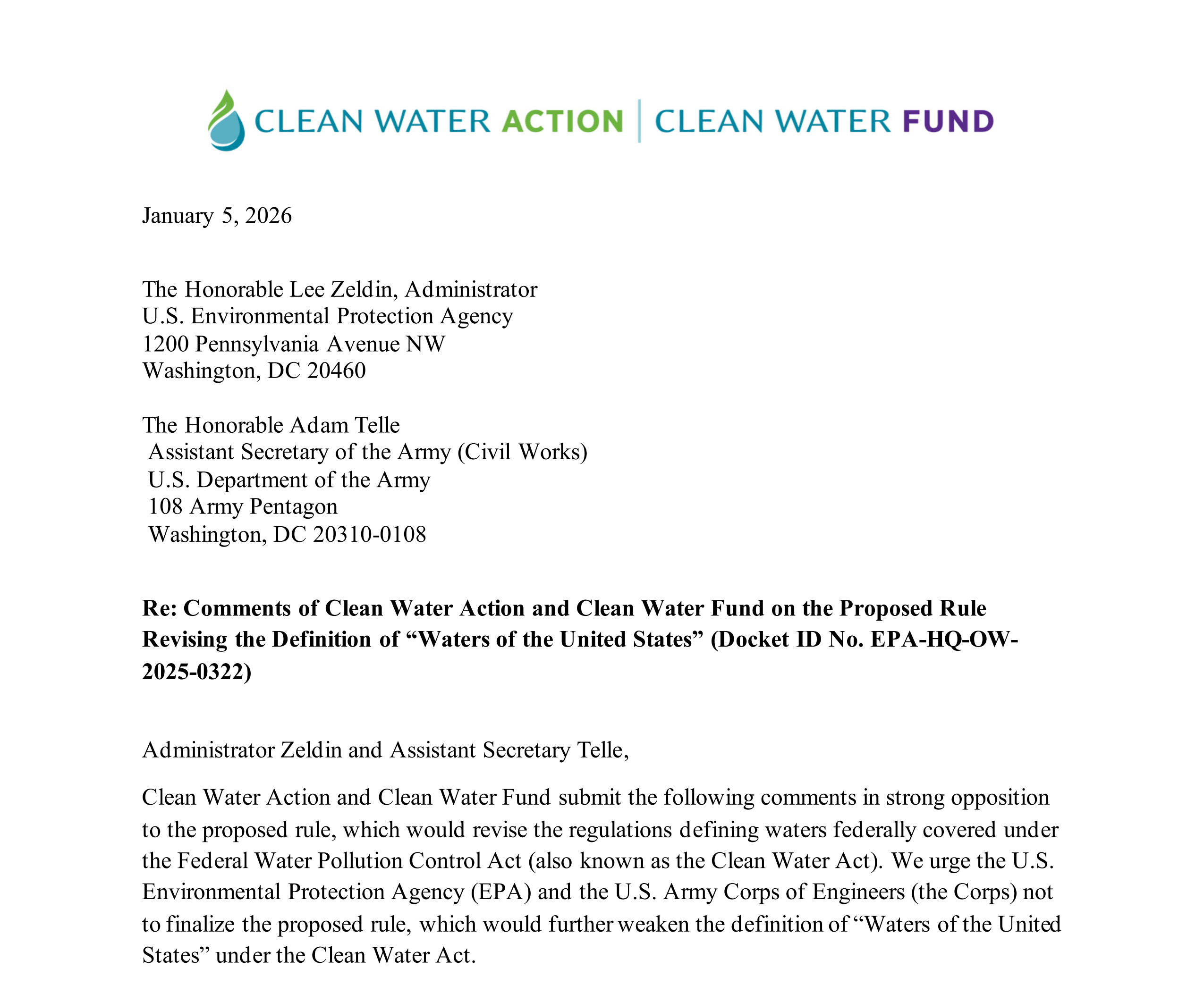 Clean Water Action and Clean Water Fund urge EPA not to finalize this rule. The agencies should instead maintain a definition of “Waters of the United States” without introducing additional, unsupported restrictions that further erode Clean Water Act protections.