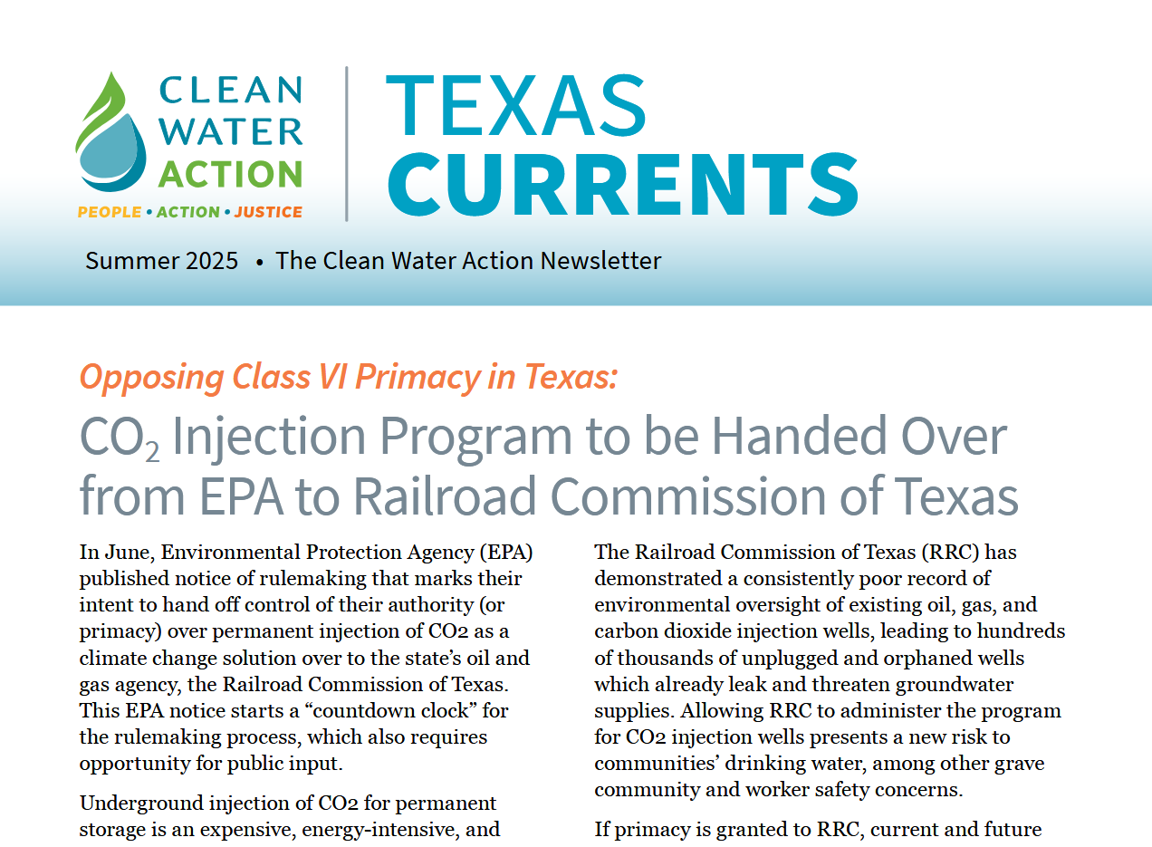 Take Action! The Environmental Protection Agency (EPA) is collecting public comments and hosting at least one virtual hearing about whether to grant primary authority over carbon injection projects to the Railroad Commission of Texas, the state oil and gas agency. We would like to generate a public comment to EPA, urging them to reject the Railroad Commission’s application for carbon storage primacy. The EPA is accepting public comments until July 31, 2025, and the virtual hearing is scheduled for July 24 from 5–8pm CT.