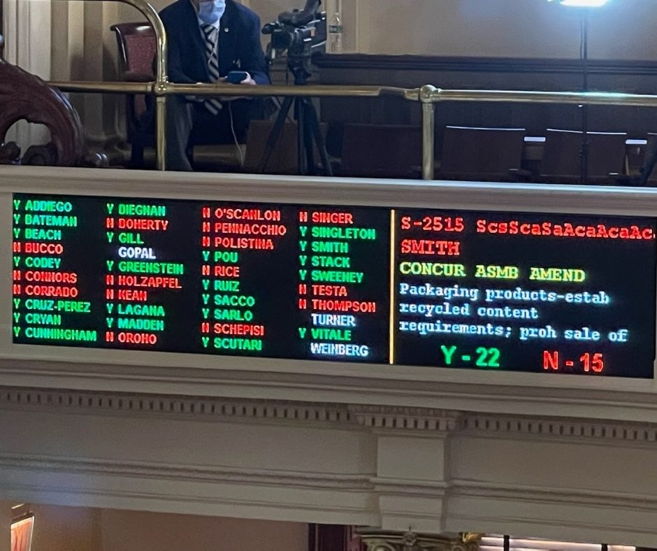 Trenton - Today, the New Jersey Assembly voted 48-23-3 and the New Jersey Senate voted 22-15 to approve the Recycled Content bill (S2515/A4676) on the final day of the legislative session. The bill would require increasing post-consumer recycled content in a variety of packaging products including plastic containers, plastic beverage containers, plastic & paper bags, plastic trash bags & glass containers. The legislation now goes to Gov. Murphy who will have 7 days to decide the bill's fate.