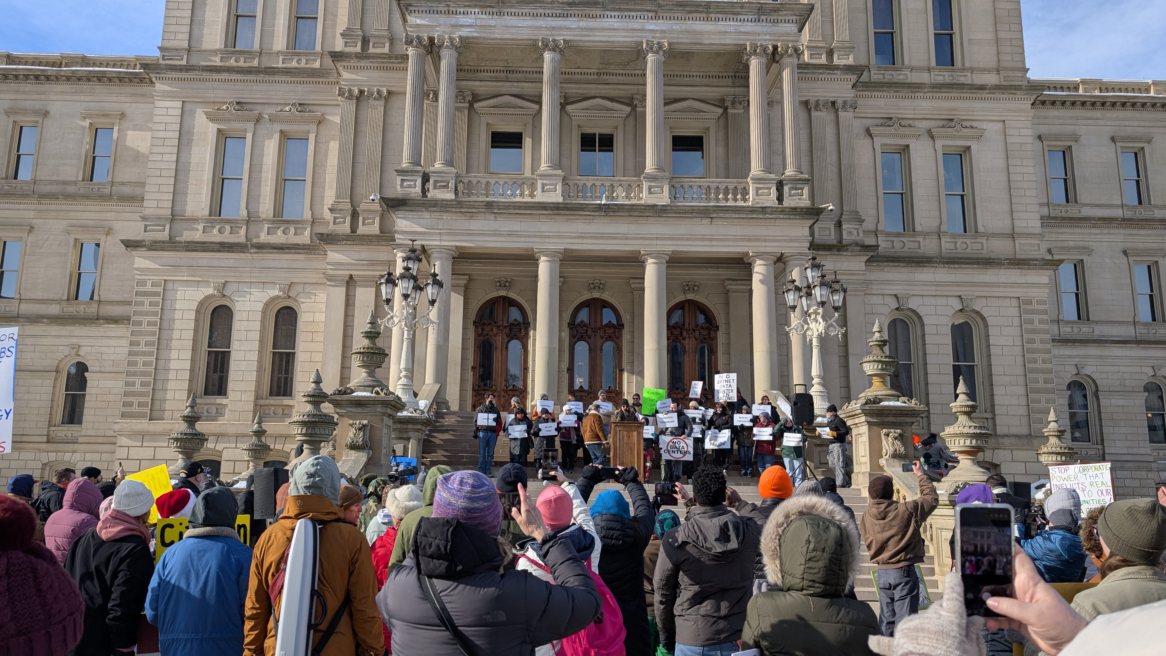 Lansing, MI – On December 16th, 2025, concerned citizens from across the political spectrum and across the state rallied on the steps of Lansing in a rare moment of nonpartisan opposition to data centers. Referring to themselves as Michiganders Against Data Centers, everyday folks converged on the state capitol to call out the rampant political corruption driving the explosion in data center proposals rippling across Michigan.