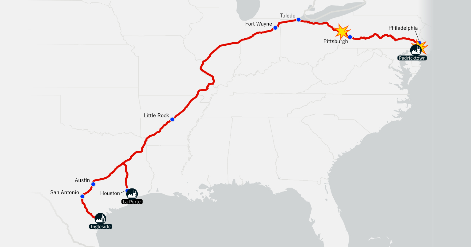 The report estimates that more than three million people live within a mile of the train route, which passes through eight major cities from Houston to Philadelphia. In addition to the East Palestine, Ohio disaster in 2023, another accident in 2012 in Paulsboro, New Jersey involved the same route. In both cases, the trains were traveling to OxyVinyls PVC plants in New Jersey using nearly 2,000 miles of track, the longest route in the country for rail transport of vinyl chloride.