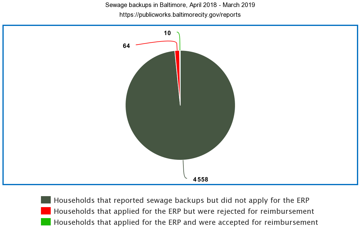 - In Quarter #5 (October-December 2018), no SSOs were eliminated, but the report shared that the City has approval for designs required to eliminate one, and had proposed plans to eliminate two more. A notice to process for construction was given for sewer collection system improvements in the North West area of Baltimore. The report noted that DPW was continuing to process applications to the Expedited Reimbursement Program, but did not provide any further information. At a public meeting in January, however, DPW employees shared with the press that 67 applications had been processed, and only 10 households had been reimbursed. 82% of the applications processed had been rejected - about a quarter of them rejected because the household did not call 311 within 24 hours of the backup occurring, and another quarter because DPW determined that the backup was not caused by rain.